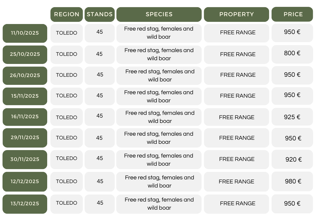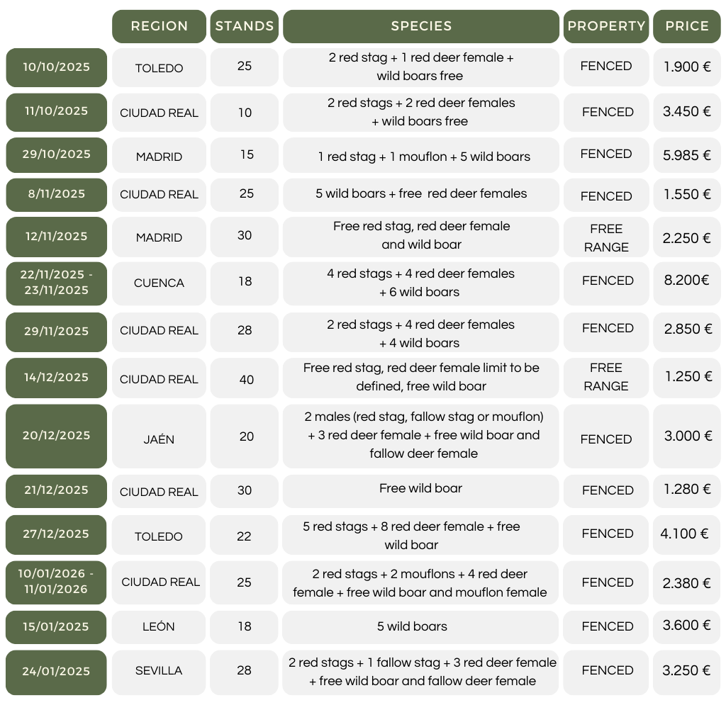 The first group includes a selection of exclusive Monterías in Spain, characterized by a reduced number of stands and a strong focus on trophy quality. If you’re interested in joining one of these premium driven hunts, feel free to contact us to check availability